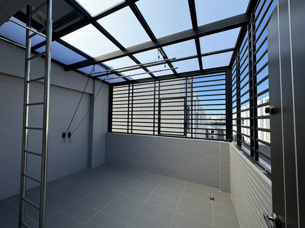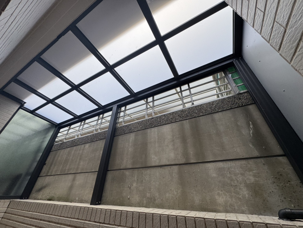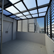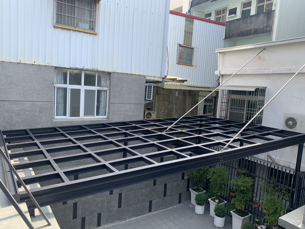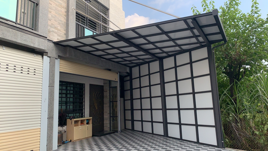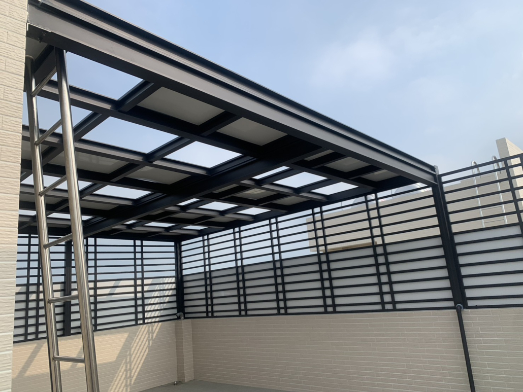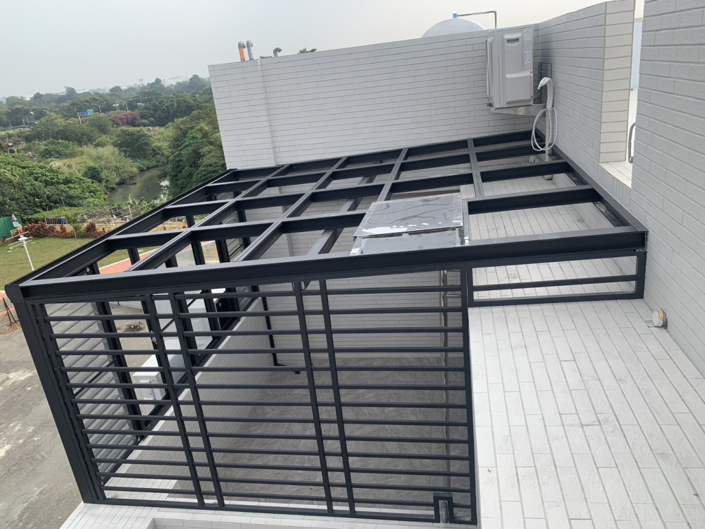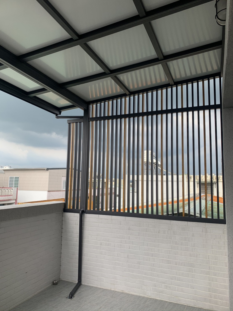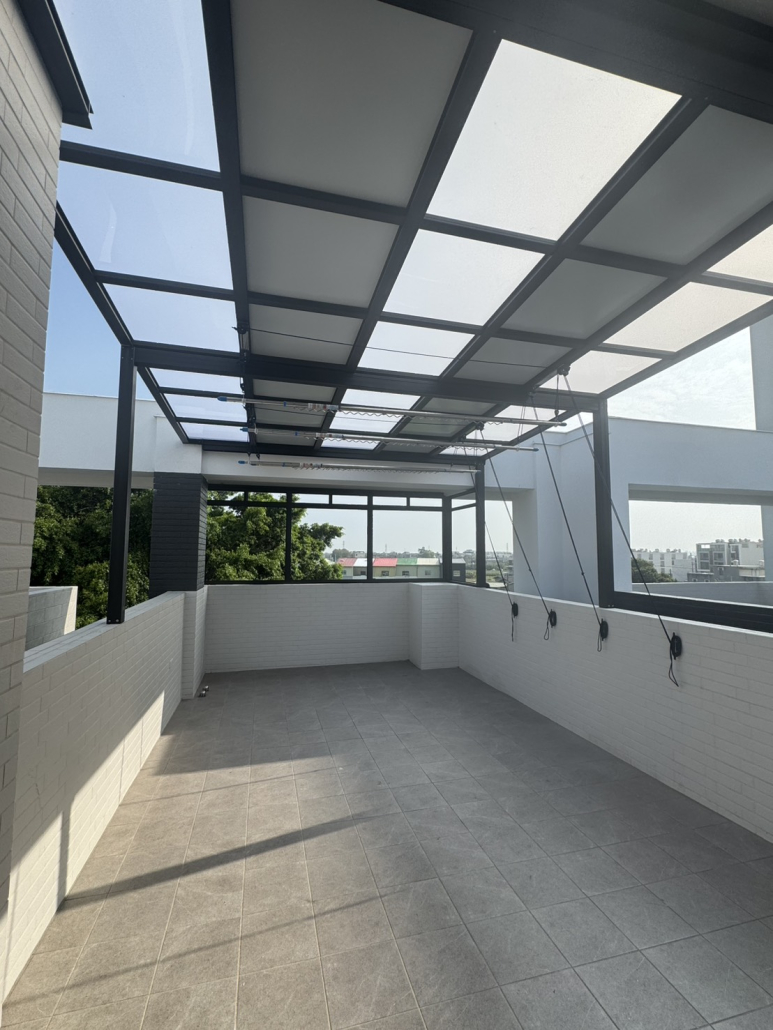 用於陽台量身打造採光罩,使用PC中空板、玻璃,具良好採光與防水效果